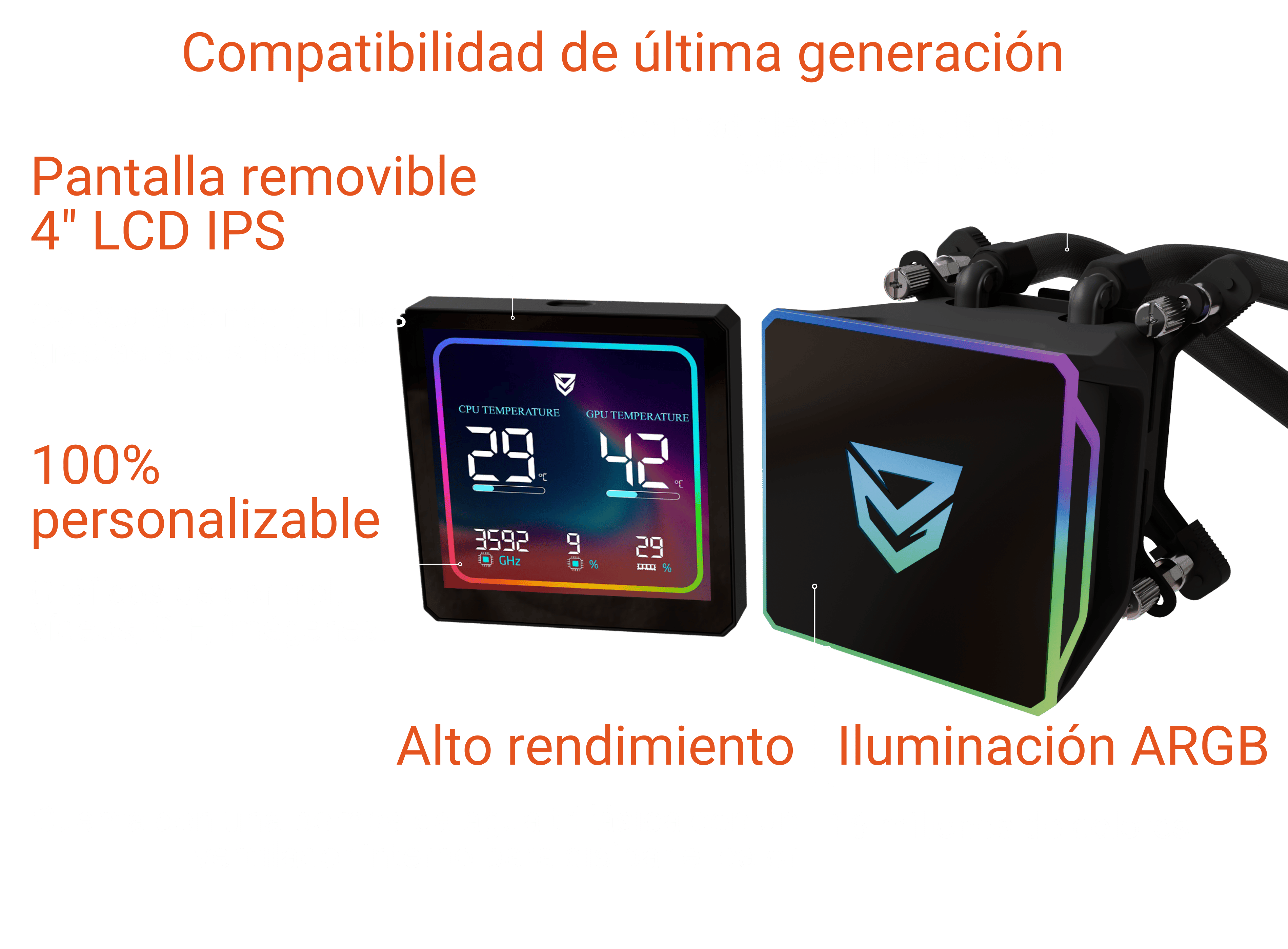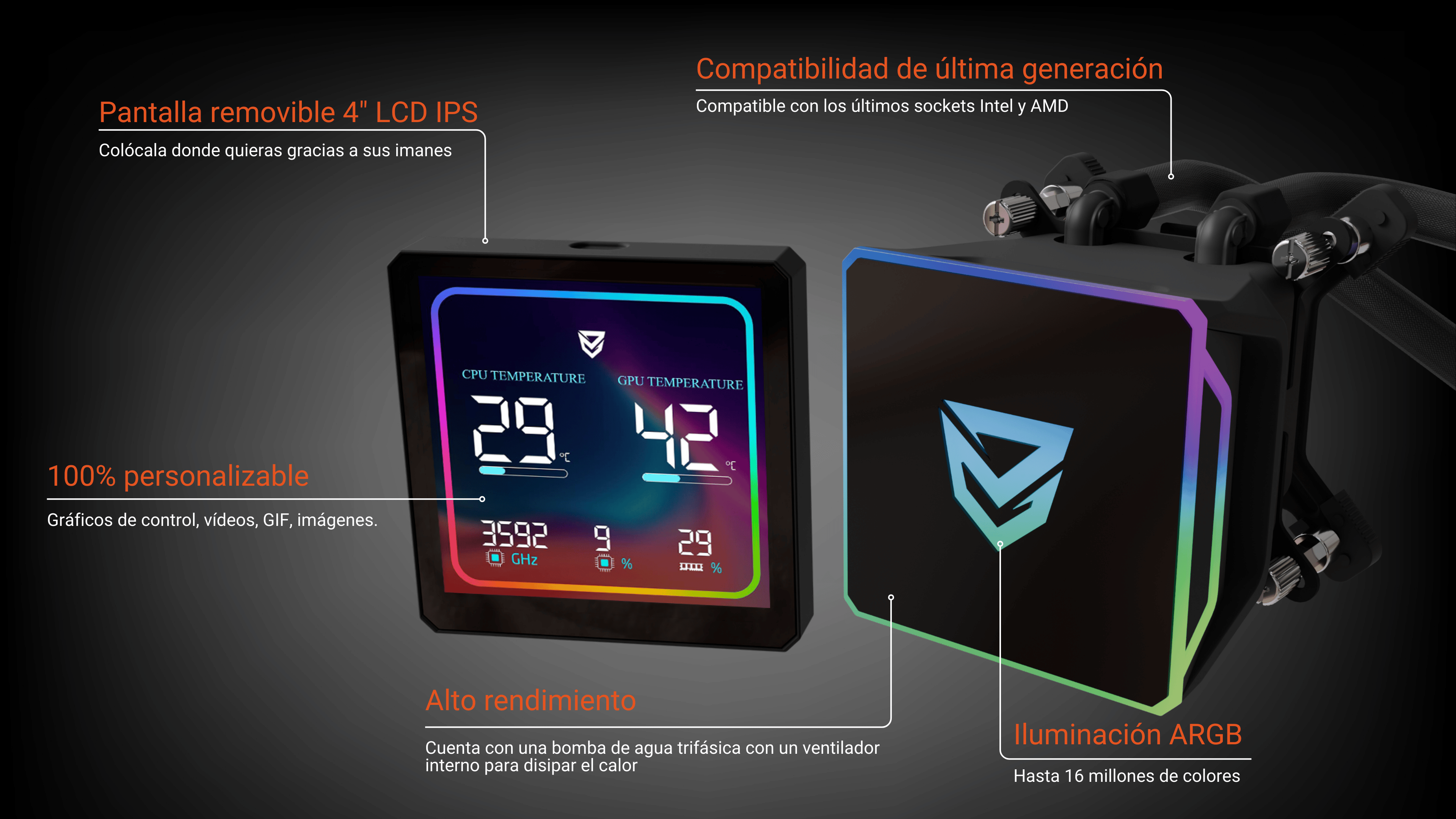 El sistema de refrigeración líquida Sedna está diseñado para proporcionar un rendimiento de enfriamiento eficiente y elegante, ideal para los entusiastas de la informática y los gamers que buscan mantener sus sistemas funcionando a temperaturas óptimas. Con un diseño moderno que incluye un bloque de refrigeración y una pantalla LCD de 4 pulgadas, este sistema combina funcionalidad y estilo.
